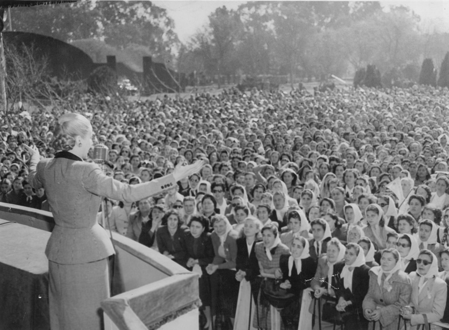Eva, la actriz, había encarnado en la radio un conjunto de mujeres notables. Templada en la épica, encontró un resonar que haría propio en la gran escena nacional el pasaje de la seducción radiofónica de la actriz a su reproducción como interpelación política: la militante en el camarín. Alguien que construye un papel y lo interpreta. En toda escena hay un modo de habitarla, que se construye con todos los elementos a disposición: unas marcas en el lenguaje, un tono, unas posibilidades en el cuerpo, recursos narrativos, histrionismos. Los de Eva eran precisos y eficaces, habían sido moldeados en el melodrama y en la fortísima conciencia de la propia imagen.