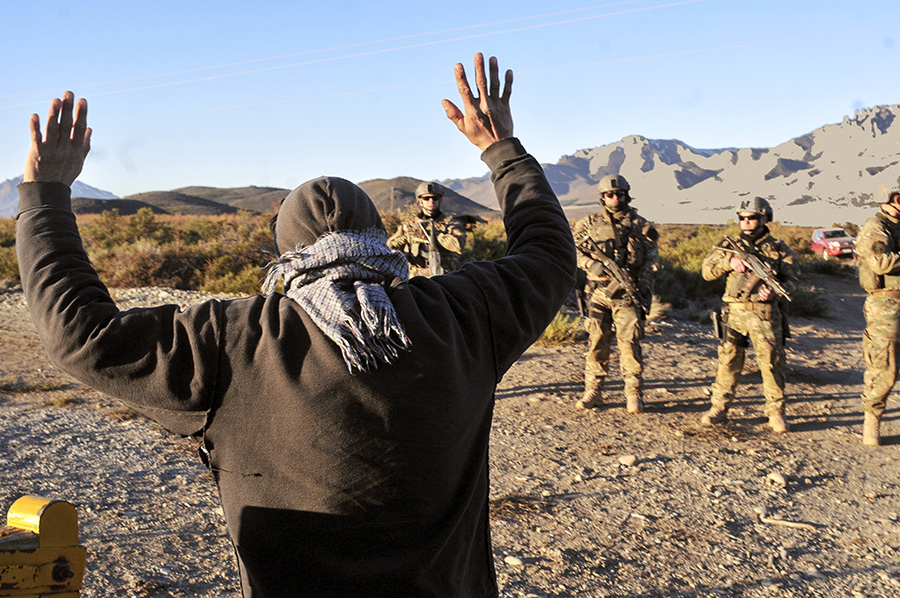 Weichafe (guerrero) amenazado durante el operativo ordenado por el juez Guido Otranto, en coordinación con el ministerio de seguridad de la nación, con más de 300 efectivos de PF, GEOP (en la imagen), helicópteros, canes, drones. Foto: Gustavo Zaninelli/ Fototeca ARGRA.