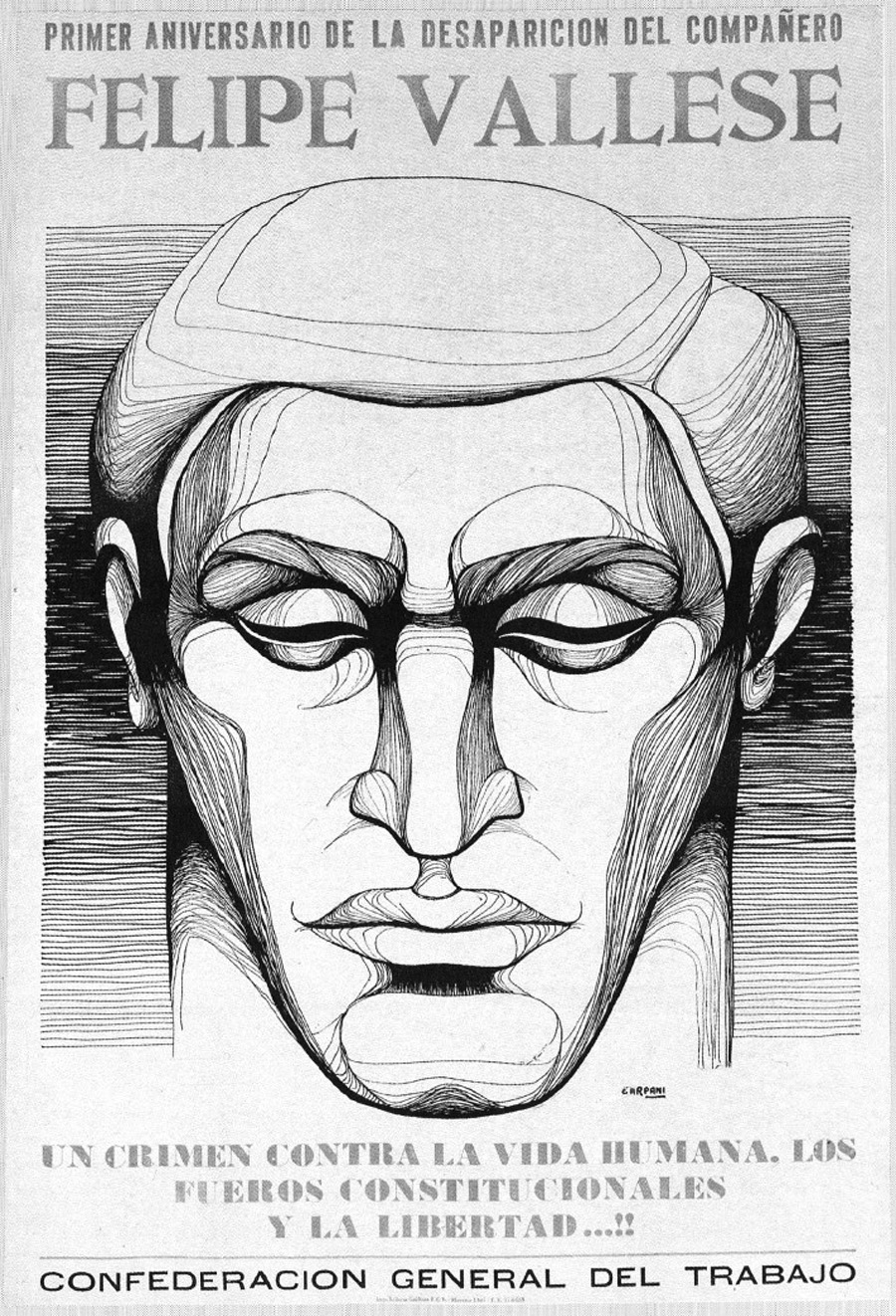 Afiche de la CGT por el primer aniversario de la desaparición de Vallese. Realizado por Ricardo Carpani. Año 1963