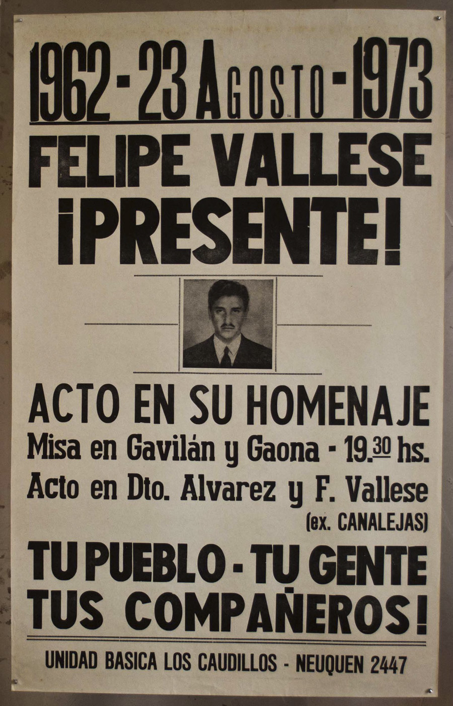 Afiche convocatoria a un Acto homenaje a Felipe Vallese organizado por una Unidad Básica del barrio de Flores. Año 1973