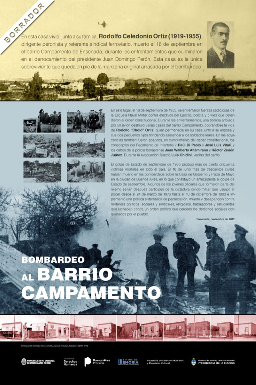 ¿Qué había pasado aquel 16 de septiembre de 1955? Todo lo que se conocía, hasta que el Flaco acometió tareas de detective, era por la cobertura de la prensa de Uruguay y por diarios locales de La Plata. Unas bombas arrojadas por aviones atribuidas a la luego llamada Revolución Libertadora cayeron en el Río de La Plata y al menos una de ellas en el barrio Campamento de Ensenada, próximo al puerto de Ensenada y considerado como bastión peronista. Destruyeron una manzana entera, de once casas. Y mataron a una persona: Rodolfo Celedonio “Cholo” Ortíz, obrero ferroviario. “No quedó nada por encima de los 50 centímetros, sacando la casa de una esquina que se desplazó un metro. En esa casa vivían mis abuelos”, reconstruye Ortíz, que como su padre fue un ex dirigente ferroviario que protagonizó en 1991 la famosa huelga de 45 días contra la destrucción de los ferrocarriles en el menemismo.