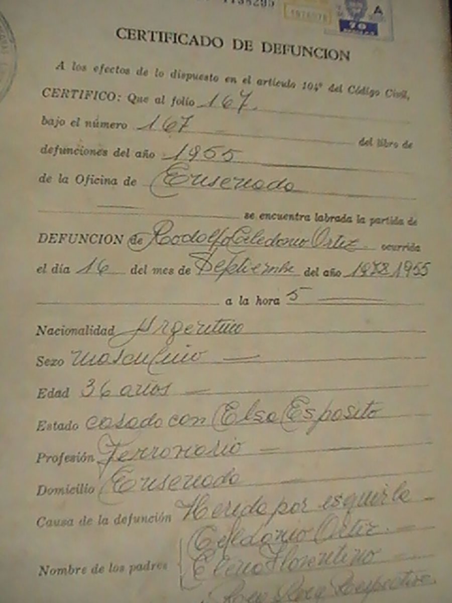 Certificado de defunción de Rodolfo "Cholo" Ortíz