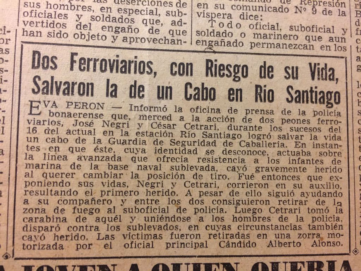Noticia en un diario local ligada al bombardeo. En ese momento la ciudad de La Plata se llamaba Eva Perón