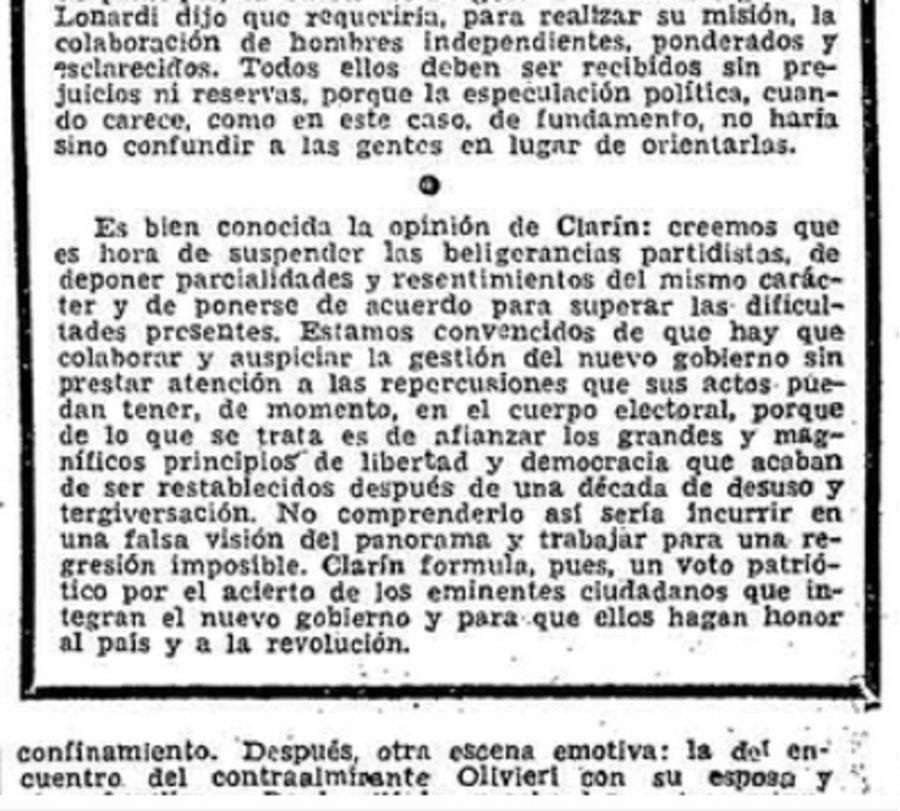 Editorial del diario Clarín en apoyo a la Revolución "Libertadora"