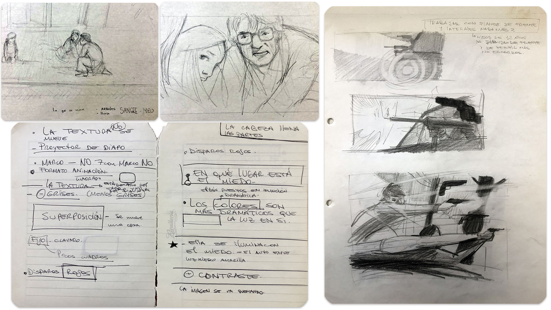 En los apuntes que reproducimos en esta entrega pueden verse algunas de las anotaciones del ilustrador sobre el proceso de trabajo de la primera animación, la de apertura del film: “¿En qué lugar está el miedo”? O “los colores están puestos en función dramática”.