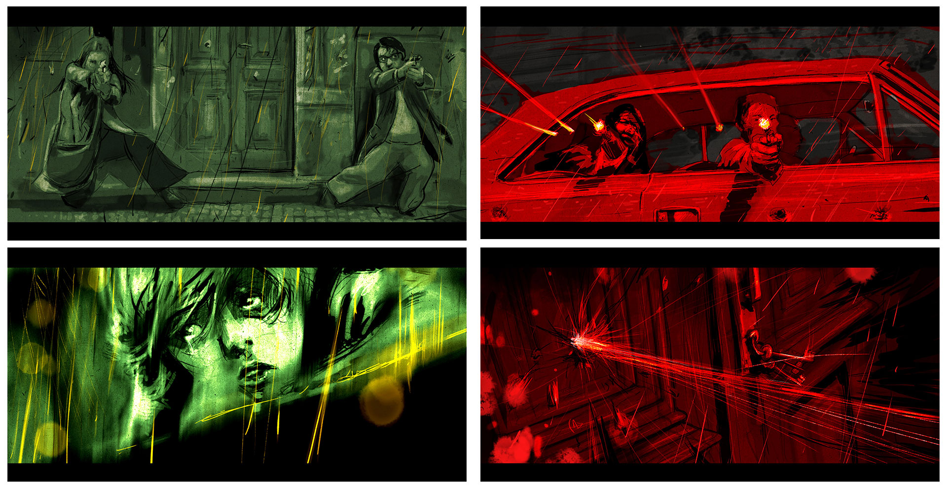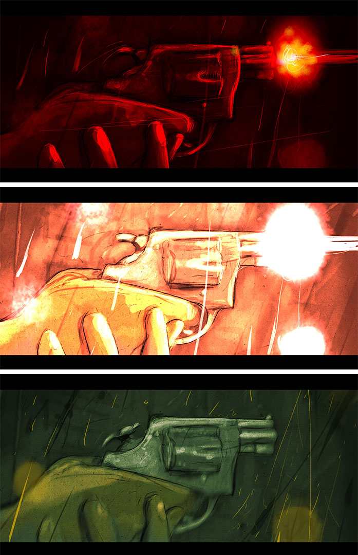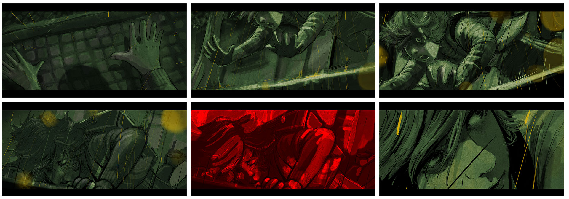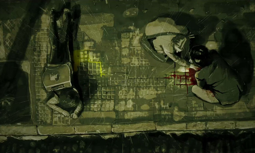 Otro elemento que emerge como organizador en las animaciones tiene que ver con la utilización de los colores: por ejemplo, “Benjamín quería que las noches fueran verdes (si ven la fotografía, las noches en exterior son verdes)”; que el amarillo representara el miedo. Eso a mí me costaba porque el amarillo era mi color preferido de la niñez: tenía mi plato amarillo, mi vaso amarillo… Frida Kahlo decía que el amarillo es el color de la locura, pero, trabajándolo encontré como que hay algo entre el amarillo y el verde que da una cosa medio de moho. Y por supuesto el color rojo simbolizando la sangre y la violencia”.