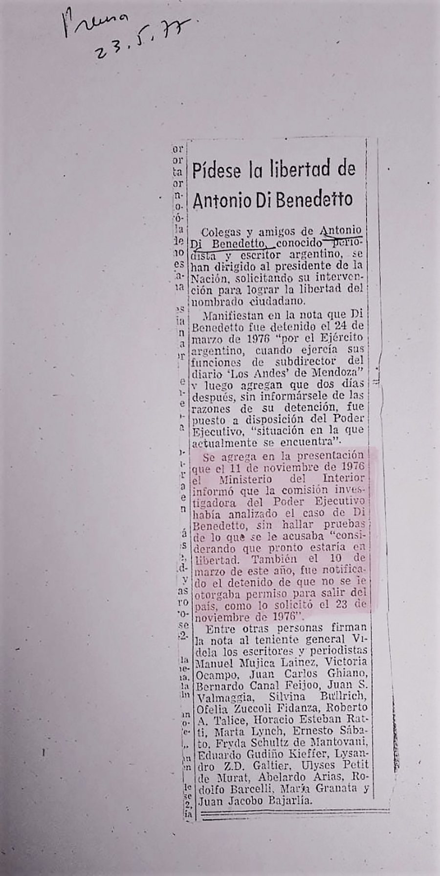 Hacia la madrugada del 24 de marzo, el Ejército inició una seguidilla de arremetidas contra la prensa en Mendoza: a bazucazos atacó el Sindicato de Prensa de Mendoza y luego fue hacia la redacción de Los Andes. La incertidumbre flotaba en el aire y algunos periodistas daban vueltas por la ciudad para ver qué sucedía. Pasaron por la casa de Di Benedetto, incluso, para ver si estaba todo bien. Él estaba en la redacción. De ahí se lo llevaron. Pasaron dos meses hasta que formalizaron su detención. Ya sin él dando las directivas, el titular de Los Andes de la mañana del 24 de marzo fue “El país vive y trabaja normalmente”.  Di Benedetto estaba detenido, pero no hubo para él pedido de libertad, ni acompañamiento a su familia. Quienes lo conocían coinciden en que el borramiento fue total. El 31 de mayo de 1976 lo dejaron cesante. A las pocas semanas de la detención, algunos diarios nacionales comenzaron a hacer públicos los pedidos por su libertad. En capital, el Buenos Aires Herald, dirigido por Robert Cox sumaba lo propio. También la Agencia ANCLA, creada por Rodolfo Walsh para perforar el cerco informativo de la dictadura, apuntó sobre la situación de Di Benedetto (y de la prensa en general). En su cable del 30 de agosto de 1976, titulado “El escritor Di Benedetto se halla en estado desesperante” hacía alusión a su caso, detenido “sin que se le haya formulado ningún cargo” y en violentas condiciones de cautiverio.