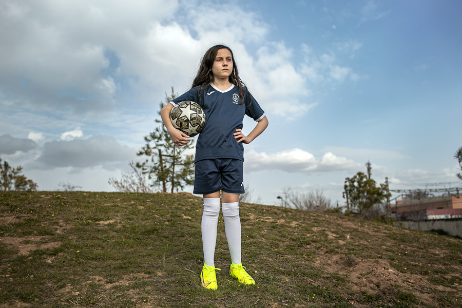 Ariadne. Ariadne tiene 12 años y desde los 6 juega al fútbol, un deporte que la apasiona desde pequeña. Nunca ha pensado que el fútbol tuviese género. Le encantaría ser futbolista profesional siempre y cuando pudiera vivir de ello, ya que de momento los salarios en el fútbol femenino no son como en el masculino. Foto: Ana Valiño. San Gabriel / España