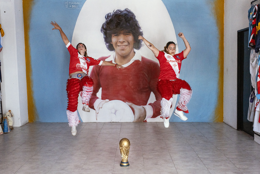 Dani y Sol. Integrantes de la murga "Los dioses de la Paternal" rindiendo homenaje a Diego Armando Maradona en el santuario construido en el estadio de AAAJ luego de su muerte. Foto: Vero Ape. Asociación Atlética Argentinos Juniors / Argentina