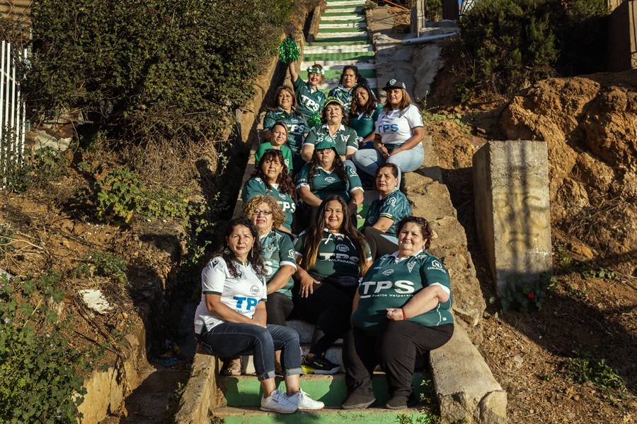 Escalera Pasaje San Marcos. Aylin y Cony, "Los Reverdes", Sally, Marta, Evelyn, María, Tere, Marcela , Daniela, Rita, Ruth, marcia, Margarita, Saida. Las "Huracan Verde" y "Las Malportadas" cuya alma y aguante hoy está con Marta y su lucha contra el cáncer alentando desde galería. Cerro Playa Ancha, Valparaíso. Foto: Manne Stoller. Club de Deportes Santiago Wandereres / Chile
