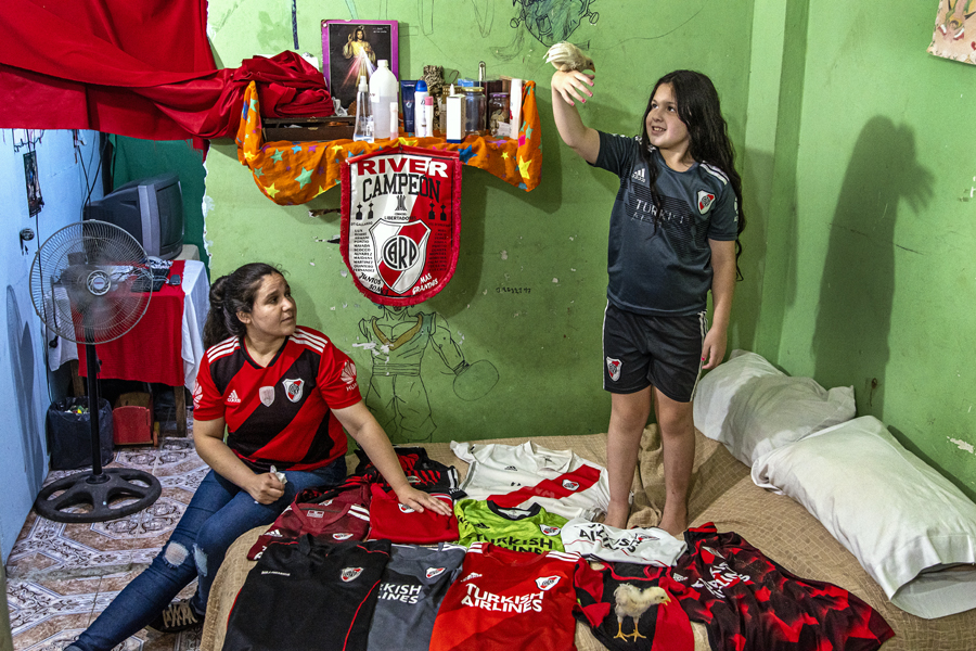 Aída Duarte y Renata Ríos. Renata es jugadora e la minis de "La Nuestra Fútbol Feminista". Nos abrió las puertas de su casa, en el Barrio 31, con la colección familiar de camisetas y sus pequeñas mascotas. Madre e hija palpitan la misma pasión, empujan por un fútbol inclusivo y sueñan con el día que puedan abrazarse en un grito de gol en el Monu. Foto: Nadia Petrizzo. Club Atlético River Plate / Argentina
