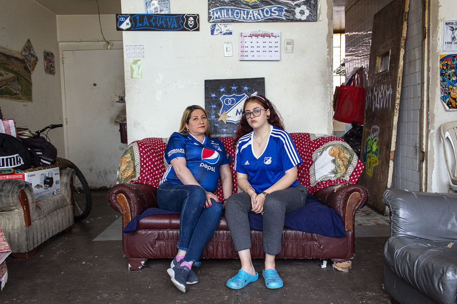 Madre e hija. Adriana (45) y Juana (18). Hinchas embajadoras, pertenecen a La Curva, una de las agrupaciones que conforman la barra de la Blue Rain del Club de Millonarios de la ciudad de Bogotá. Adriana es contadora de profesión y Juana sueña con ser abogada. Juntas van a todos los partidos de local y dicen que el equipo, más que su amor, es su forma de vivir la vida. Foto: Andrea Lezama. Millonarios Fútbol Club / Colombia