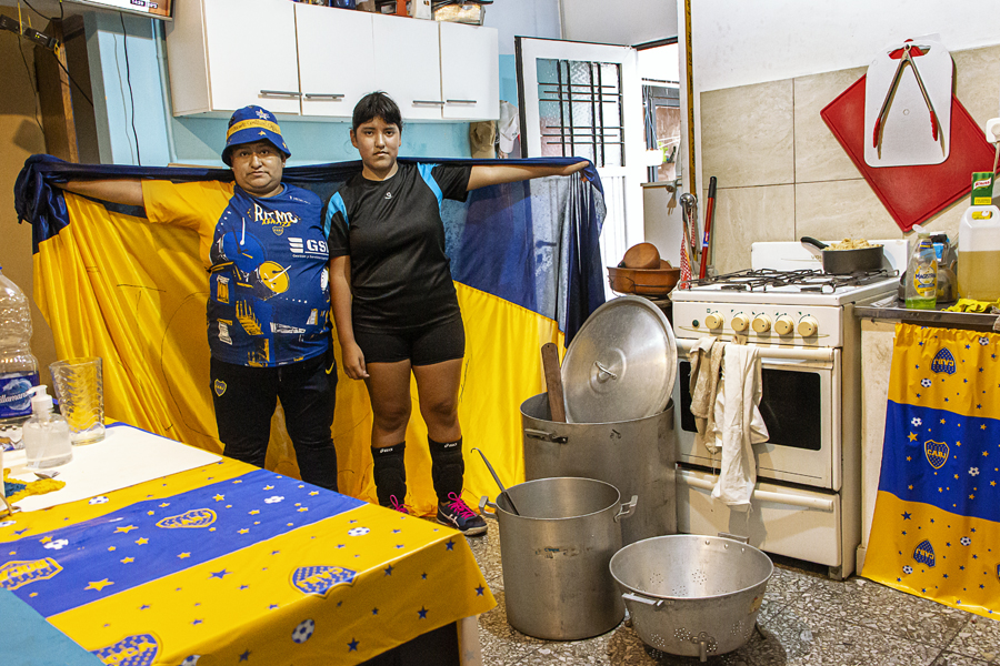 Cristina y Madeleine, el corazón de la olla Xeneixe. Cada domingo antes de armar el tablón de la olla popular en la vereda de Carlos F. Melo y Cerri, en pleno corazón de La Boca, Cristina se ocupa de un ritual: colgar la bandera xeneize de varios metros de largo que cosió a mano. El encuentro es sostenido a pulmón junto a su banda de percusión Ritmo Xeneixe y amadrinado por Chu Cossar, la gran referente de Madeleine que también juega al voley, y junto a su mamá son las más famosas en la hinchada de Las Guerreras. El barrio, la calle y el carnaval. Se escucha por ahí que Cristina no es bostera, es Boca. Foto: Cecilia Rossi. Club Atlético Boca Juniors / Argentina