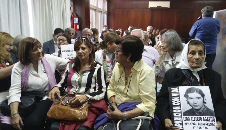 Audiencia de debate de los juicios de Lesa humanidad en el Tribunal Oral Federal de La Rioja, Diana junto a Marcela de Ledo, Madre de Plaza de mayo de la Rioja y compañeras y compañeros ex presos políticos y familiares. 2016. Foto: Gentileza Diana Quiros.