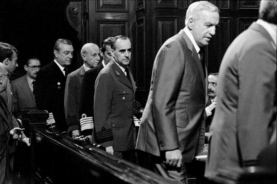 Sobre la relación de las fotos que estaban vinculadas a los militares, el fotógrafo lo describe como “intentar ganar pequeños recortes de símbolos que pudieran servir a futuro. Cuando los militares entran al juicio y están sentados en el banquillo de los acusados, la cámara de nuevo corre a lo que era testimonial duro: estos son los acusados de ser asesinos y juzgados”. También sostiene que “verlos sentados en el banquillo de acusados y verlos condenados es un hecho fundacional de la democracia argentina, y haber estado ahí me parece uno de los privilegios que me dio la cámara que para mí representa un pasaporte a ciertos lugares a los que no hubiera llegado de otra manera”.