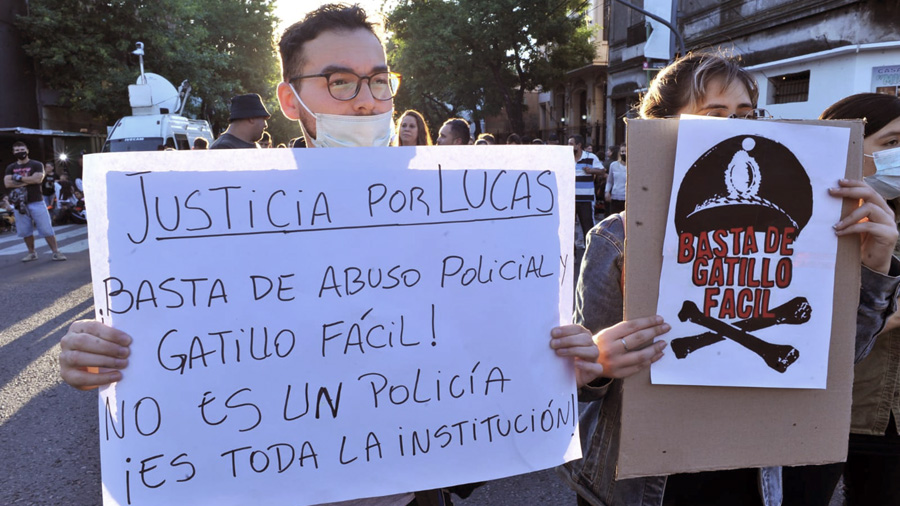 Familiares y amigos reclamaron la prisión perpetua para los tres policías acusados de asesinar a Lucas González. "Le tiraron a matar", dijeron. Cientos de personas se concentraron frente a los tribunales porteños para pedir justicia por este crimen, noviembre, 2021. Foto: Alejandro Santa cruz. Fuente: https://www.nuevodiariodesalta.com.ar