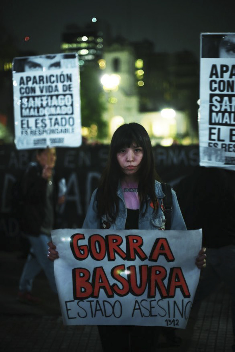 Marcha Nacional contra el Gatillo Fácil. Jornada cargada de reclamos, lucha y emoción motivada por salir a las calles a denunciar la represión estatal que ya mató a más de 5000 personas y las prácticas que persisten en democracia. Entre los miles de nombres de víctimas se repetía constantemente uno: el de Santiago Maldonado, desaparecido por el estado desde el 1 de agosto de 2017, agosto, 2017. Fotos: China Diaz. Fuente: https://www.laprimerapiedra.com.ar