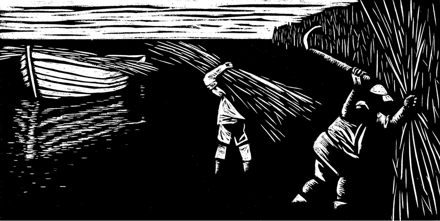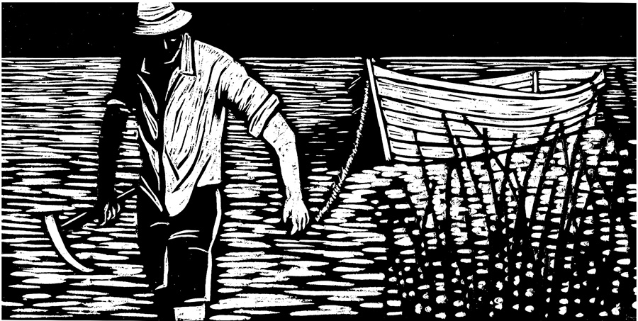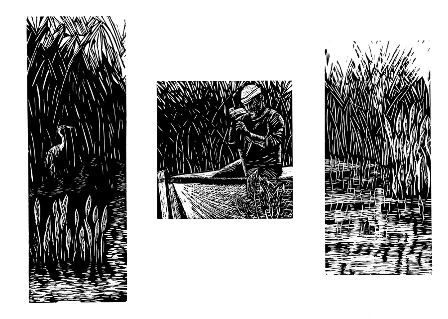 Tríptico Hombre, Junco, Garza, grabado por Hernán Broches