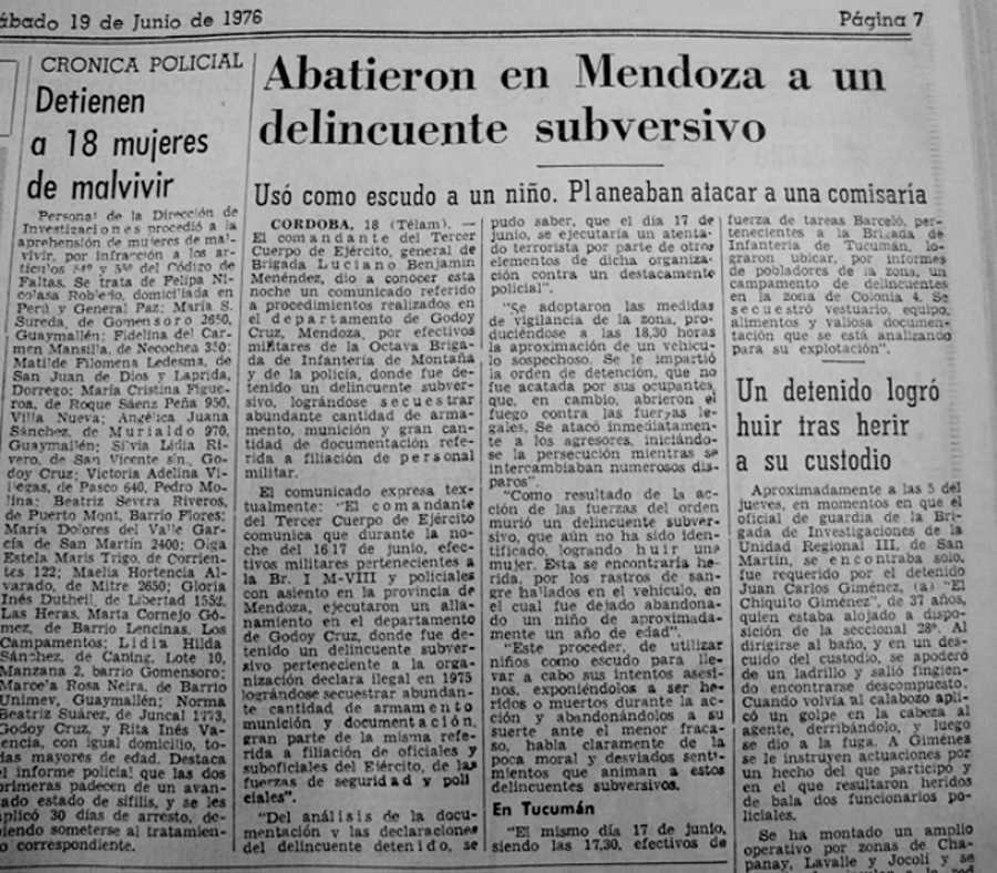 Nota del diario mendocino Los Andes del 19 de junio de 1976 en relación con el asesinato del poeta Paco Urondo.
