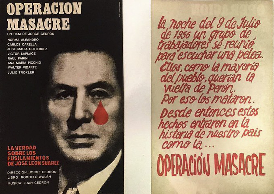 Operación Masacre, la película dirigida por Jorge Cedrón, representa diversos hitos al mismo tiempo: es la transposición cinematográfica de la obra maestra de Rodolfo Walsh; cruza ficción y documental y tiene la presencia protagónica de Julio Troxler -uno de los sobrevivientes de los fusilamientos de José León Suárez de 1956, luego asesinado por la Triple A en 1974- junto a actores de renombre como Carlos Carella, Norma Aleandro, Víctor Laplace, Ana María Picchio o Walter Vidarte; entraña una gesta épica en sus prácticas de escamoteo para el financiamiento y luego para el rodaje en clandestinidad durante la dictadura de Alejandro Agustín Lanusse; es la primera película producida en forma cooperativa; sus proyecciones en villas, barrios, escuelas, iglesias y fábricas fueron un gran aporte a la campaña que llevó a Héctor Cámpora a la presidencia en 1973; y es uno de los intentos más lúcidos de respuesta a la pregunta que recorre las últimas ocho décadas de la historia argentina: ¿Qué es el peronismo? Operación Masacre es todo eso. Y es también una obra de gran potencia narrativa y de notoria modernidad en la concepción de la puesta en escena.