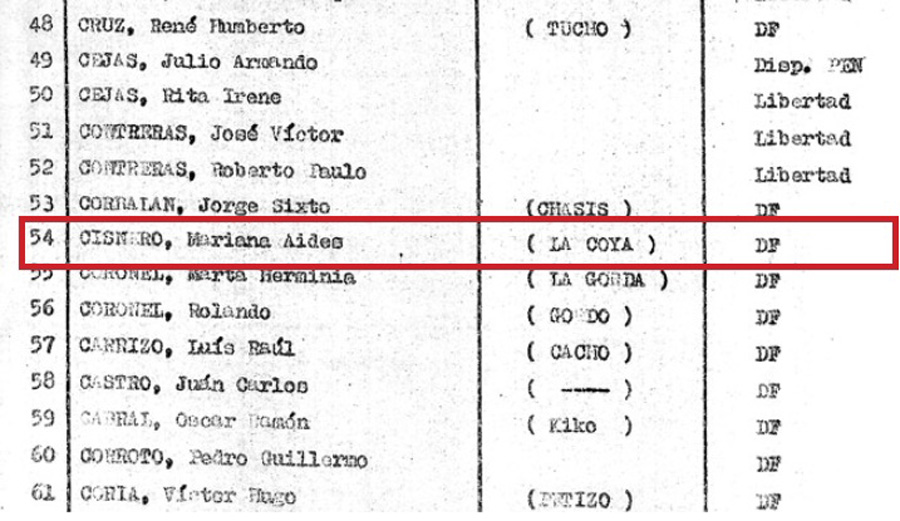 Documento con listado de detenidos desaparecidos donde figura el nombre de la desaparecida Mariana Cisneros.
