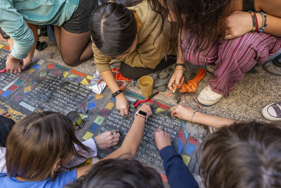 Estudiantes de la Escuela Carlos Pellegrini restauran las baldosas que recuerdan a los estudiantes desaparecidos, que amanecieron vandalizadas el 11 de agosto de 2023.