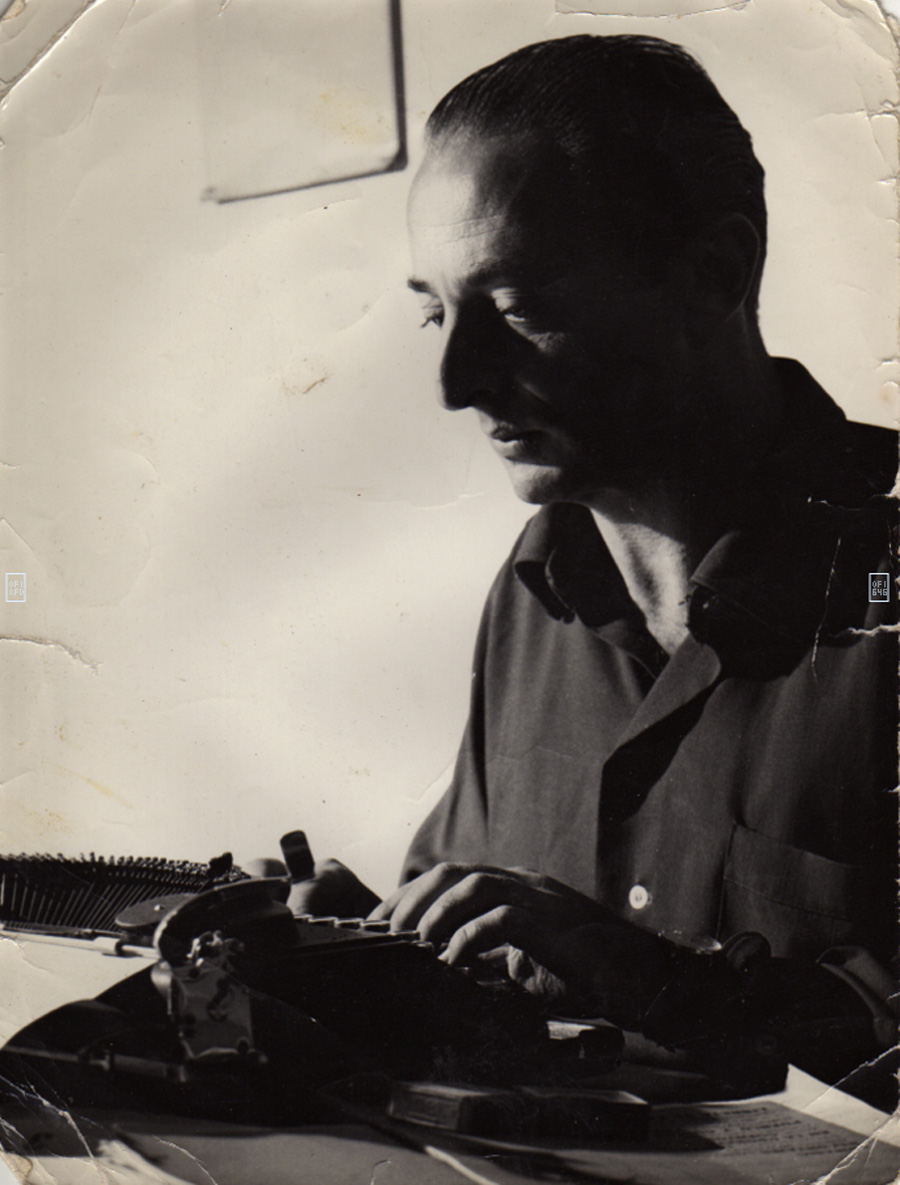 Humberto Costantini escribiendo con su máquina Olivetti (1958) Fuente: Unipe (Universidad Pedagógica Nacional)