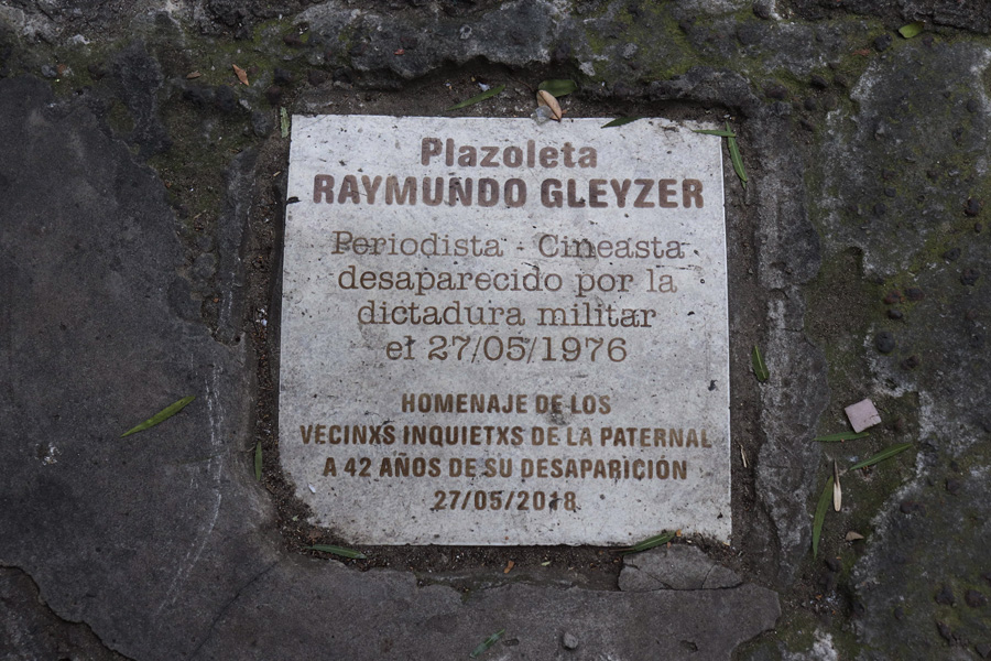 Raymundo y Juana emprendieron por esos años un viaje a Europa del Este y por Nueva York (donde Juana y el hijo de ambos, Diego, se exiliaron finalmente luego de la desaparición de Raymundo) y Ciudad de México, donde se llevó a cabo el rodaje de México, la revolución congelada, censurada oficialmente en Argentina pero que pudo verse en algunas proyecciones privadas. A pesar de la censura, fue premiada en el Festival de Locarno, Manheim y Adelaida y fue exhibida en los festivales de Cannes, Berlín, Venecia y Caracas. Impactado por la masacre de Trelew, Gleyzer produjo Ni olvido ni perdón, su trabajo sobre aquella malograda fuga de integrantes de todas las fuerzas revolucionarias de la época del penal de Rawson, la posterior toma del aeropuerto de la vecina ciudad de Trelew y la masacre final de los evadidos a manos del ejército. Luego vendrían Los traidores y Me matan si no trabajo y si trabajo me matan, tal vez sus dos obras fundamentales sobre la lucha de la clase obrera argentina, sus pesares y la sinuosa relación que, desde su perspectiva ideológica, tenía con la dirigencia política y sindical. La profundidad y contundencia de las películas de Gleyzer lo convirtieron rápidamente en una referencia del campo del documentalismo político incluso hasta nuestros días, reconocimiento que hizo que el 27 de mayo, día de su desaparición, se celebre el Día del Documentalista. En el barrio que lo vió nacer, una placa ubicada en una modesta plazoleta en la esquina de Donato Álvarez y Juan Agustín García lo recuerda. Violentada, como muchos de esos homenajes a cielo abierto que hay en la ciudad, la placa fue restaurada y restituida un par de veces por vecinos y vecinas que conforman el grupo "La Paternal no olvida" que, como en muchos otros barrios, se encarga de disputarle al paso del tiempo la escritura de una historia local que está siempre en construcción. “En 1999 la Comisión Directiva del club decidió expulsar como Socio Honorario a Guillermo “Pajarito” Suárez Mason - uno de los genocidas más caracterizados de la dictadura - y ese fue un paso enorme para el club. Pero - aclaran desde la Comisión de Derechos Humanos - faltaba decir que estos siete compañeros entre los que está Raymundo también formaron parte de la historia del club y del barrio, una historia que se sigue contando y de la que no nos vamos a olvidar nunca”.