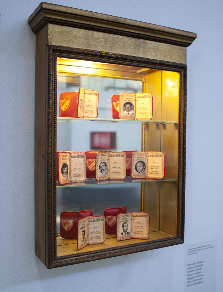 Vitrina en sala de la muestra Hemos conocido horas de triunfo. Carnets de socios desaprecidos durante la última dictadura militar de la Asociación Atlética Argentinos Juniors.