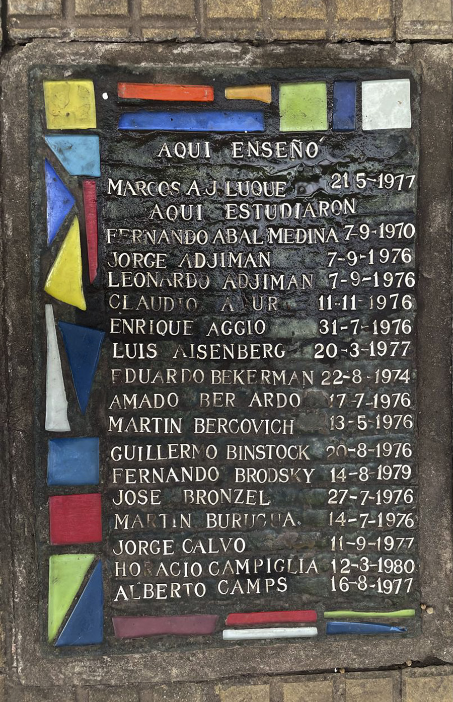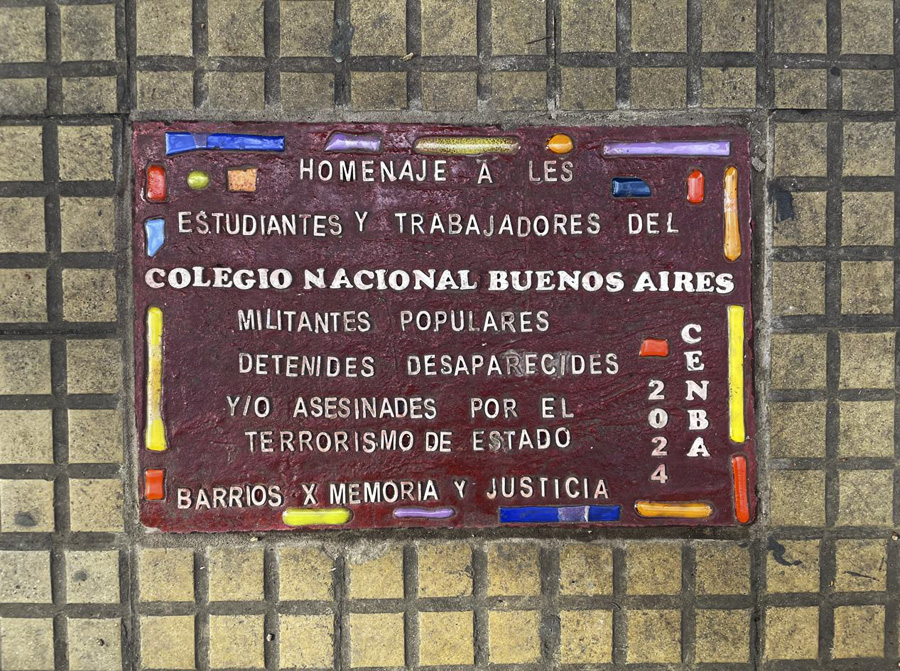 Baldosa x la memoria donde se recuerda a estudiantes y docentes detenidxs desaparecidxs, entre otros, a Horacio Campiglia. Colegio Nacional Buenos Aires, 2024.