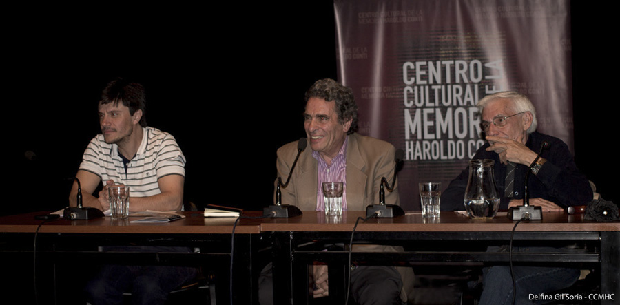 Eduardo Jozami junto a Matías Cerezo y al ensayista Eduardo Grüner en una actividad en el Conti.